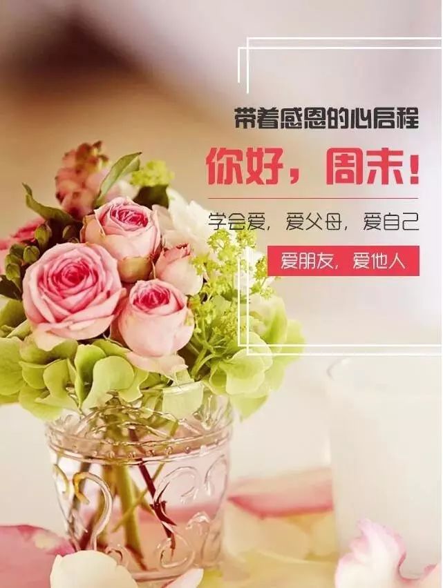 1、身体是革命的本钱,多锻炼;平安是幸福的方向,多保重;勤奋是成功的筹码,多努力;开心是快乐的源泉,多微笑;周末是心灵的港湾,多休息;朋友是生活的阳光,多联系!愿好友周末开心百分百,生活更精彩!