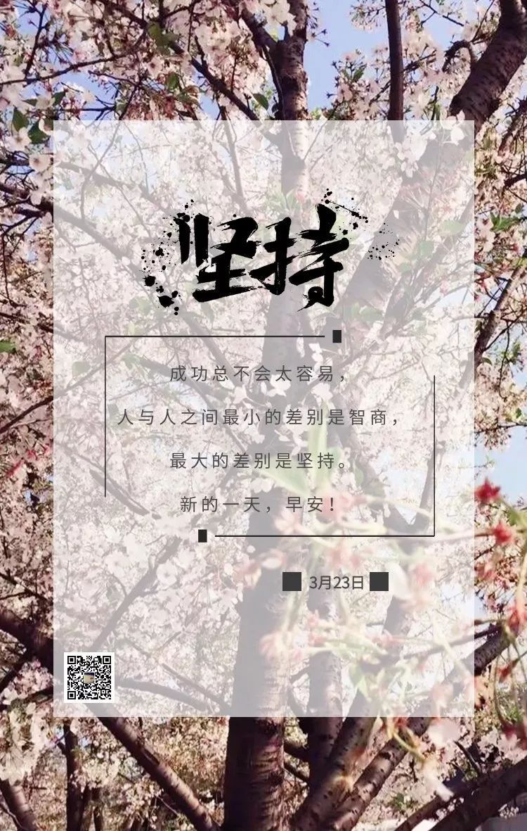 坚持到底,才能笑到最后。人可以打败自己,也可以成全自己。没有人知道下一秒会发生什么,只要这一秒不放弃,下一秒就有可能会出现奇迹。成功的人不一定是那些条件最好、能力最强的,却一定是那些意志最坚定、战斗力最顽强的。只要不抛弃梦想,不放弃努力,你也可以见证奇迹!早上好!