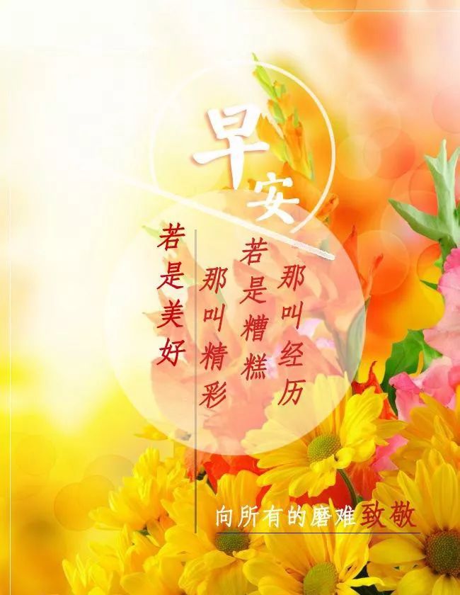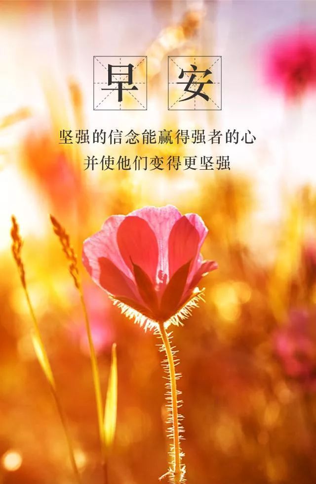 7、 也许你的生活并不富裕;也许你的工作不够好;也许你正处在困境中;也许你被情所弃。不论什么原因,请你在出门时,一定要把自己打份得清清爽爽,漂漂亮亮,昂起头,挺起胸,面带微笑,从容自若地面对生活。只要你自己真正撑起来了,别人无论如何是压不垮你的,内心的强大才是真正的强大。早安!