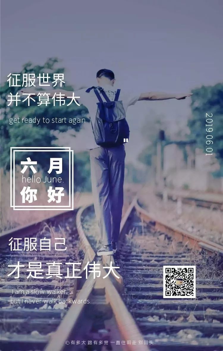 7、 只有超越自我,才可以俯瞰世界。有自信,才会有未来。坚定的信心,能使平凡的人做出惊人的事业。自信是成功的源泉,在做任何事情的时候,如果我们能够充分肯定自我,就等于成功了一半。只有满怀自信,才能超越自我。天助自助者,一个人如果没有自信,连上天都不会帮他。早安,六月你好!