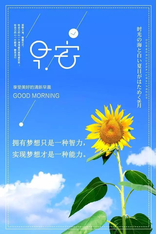 4、人生是一个旋转的阶梯,我们不可能在一生中平步青云,坎坷、磨难、艰辛,说不定在什么时候就会蚕食我们内心的一些快乐和美丽。所以,我们决不可失去快乐的心,失去追求希望的勇气,更不可丧失一双与风雨搏击的翅膀。路没有尽头,人生更不会因一时的不幸和痛苦而步入绝境。早安!