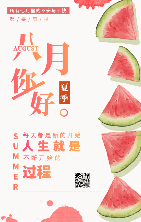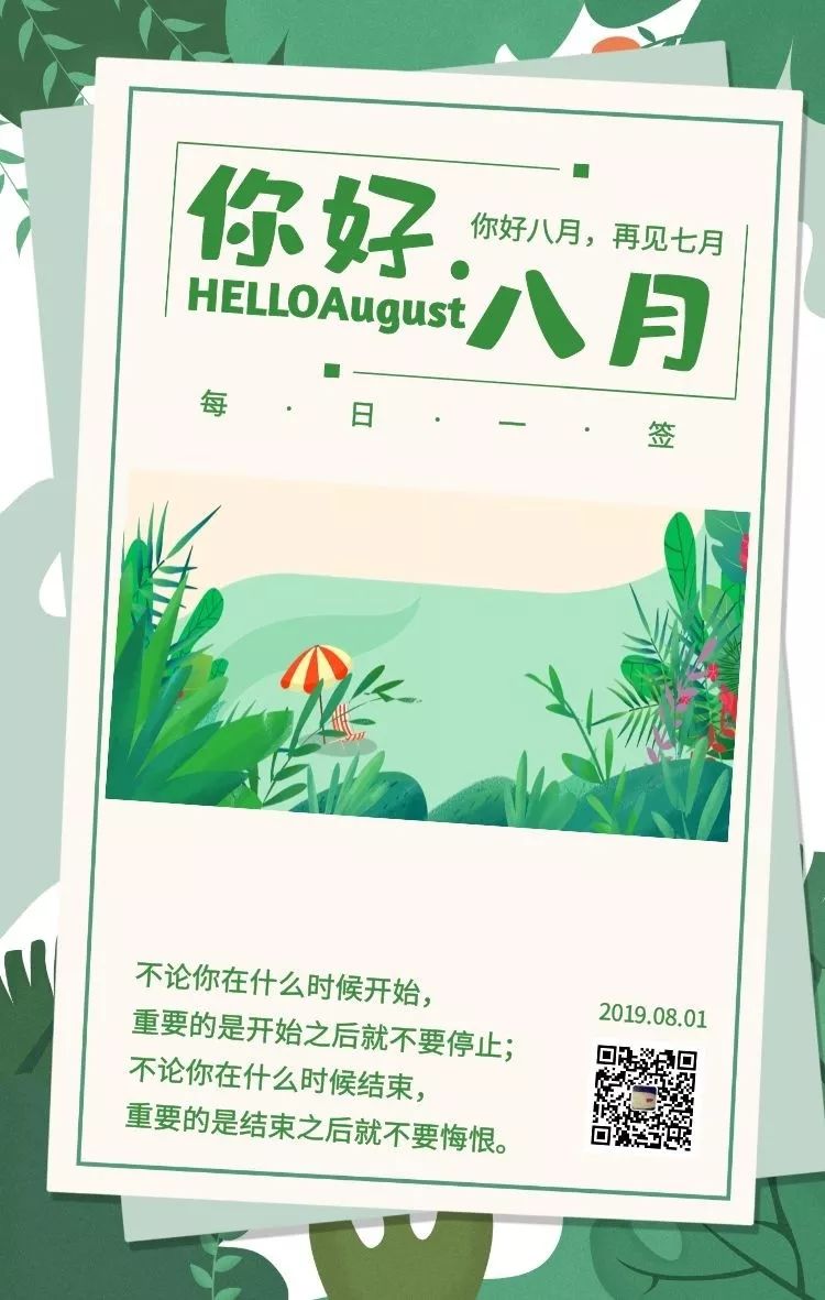 2、八月,盛夏,是植物生长最快的季节。要相信,万物都有灵性,只有迎着烈日生长的植物,才能够收获秋天的果实。人也一样,能够顶着困难前进的人,收获一定比平常的人更大更多。记住,强兵是打出来的,骏马是跑出来的,遇事别害怕,别担心,一切都可以战胜!八月,一起努力吧!