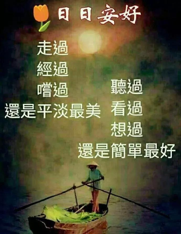 4、人生,不过一杯茶,满也好,少也好,争个什么!浓也好,淡也好,自有味道。急也好,缓也好,那又如何?暖也好,冷也好,相视一笑。人生,因为在乎,所以痛苦。因为怀疑,所以伤害。因为看轻,所以快乐。因为看淡,所以幸福。我们都是天地的过客,很多人事,我们都做不了主。早安!