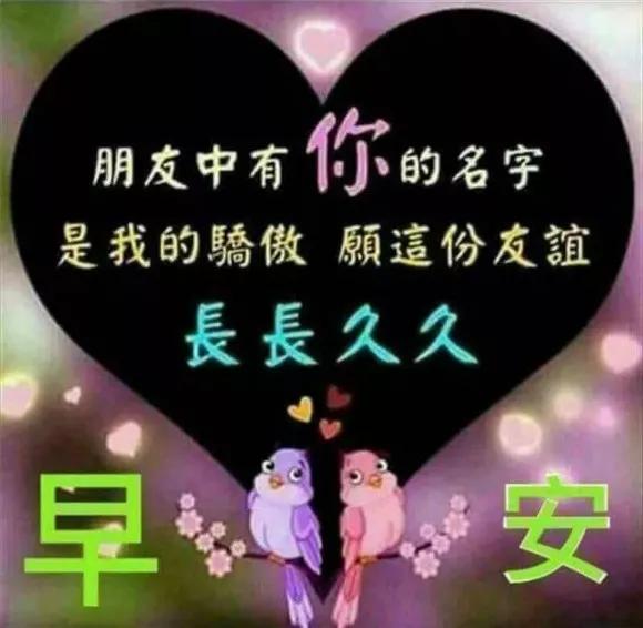 6、友谊,永远在心里珍惜;问候,永远在空间传递;牵挂,永远在天涯海角;祝福,永远充满温馨;祝开心快乐,幸福永远!!心中有爱春暖花开;心中友善美丽常在;心中有德含载万物;大家早上好