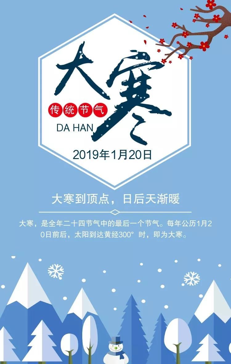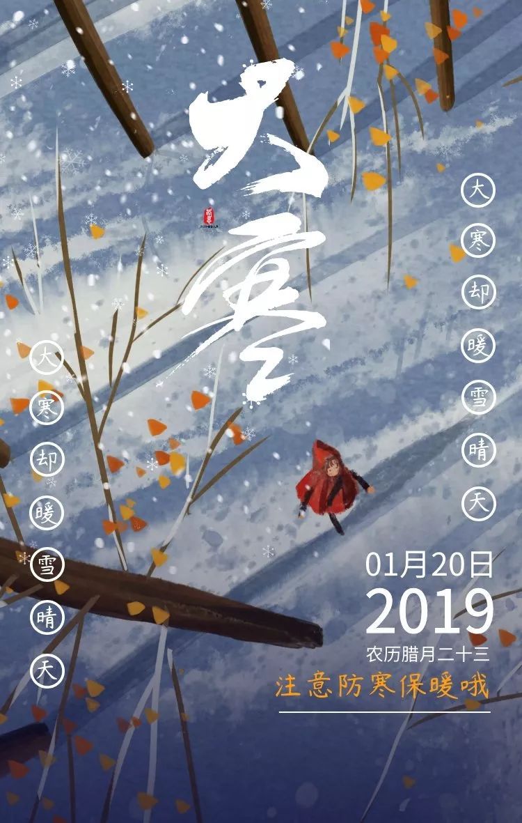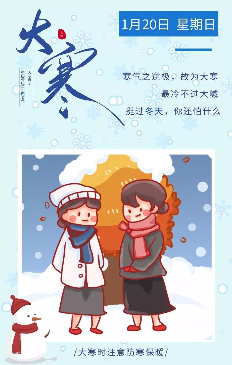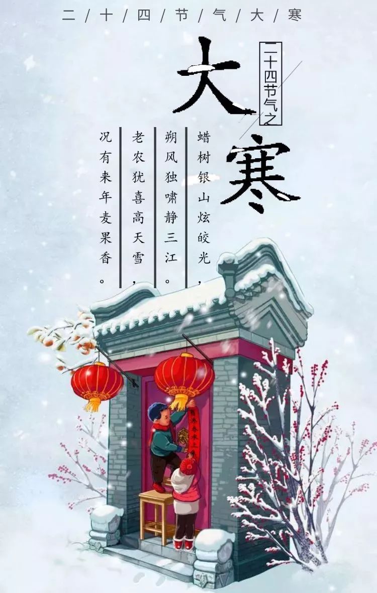 5、 冰天雪地气温降,大寒时节到身旁。寒潮侵袭须提防,保暖防寒记心房。温补锻炼两不忘,五谷杂粮最健康。顺应天时精神养,一生无忧健如钢。大寒快乐呦!