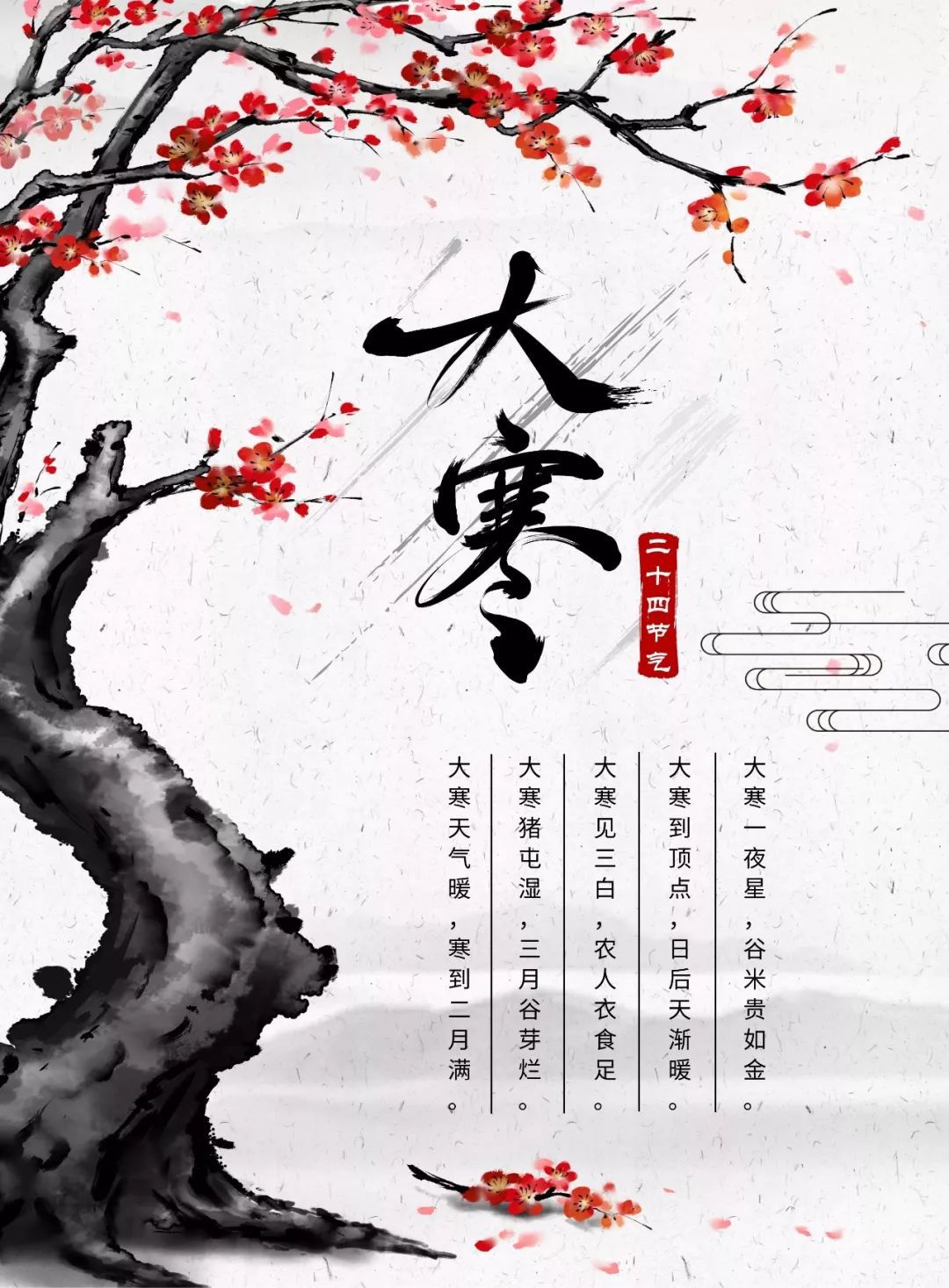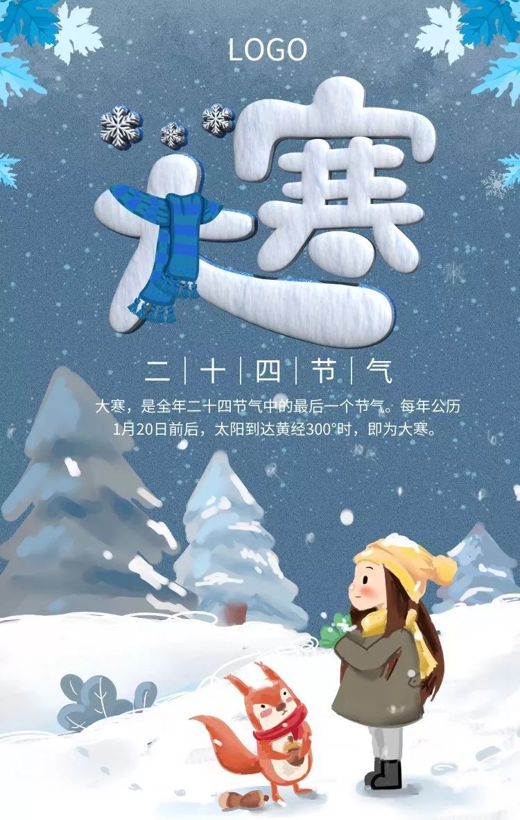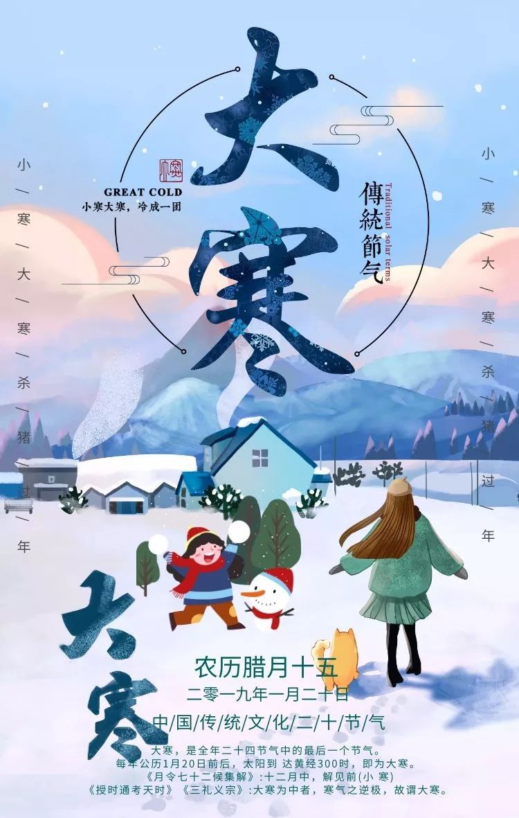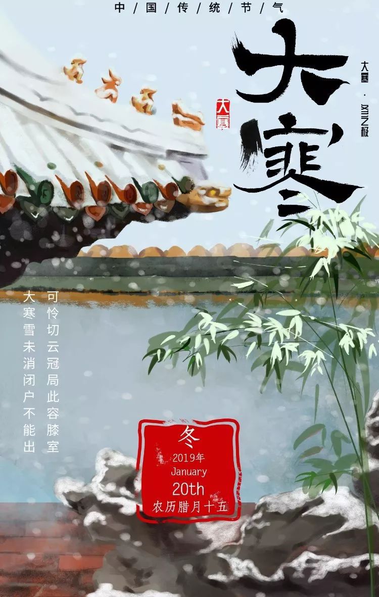5、 冰天雪地气温降,大寒时节到身旁。寒潮侵袭须提防,保暖防寒记心房。温补锻炼两不忘,五谷杂粮最健康。顺应天时精神养,一生无忧健如钢。大寒快乐呦!
