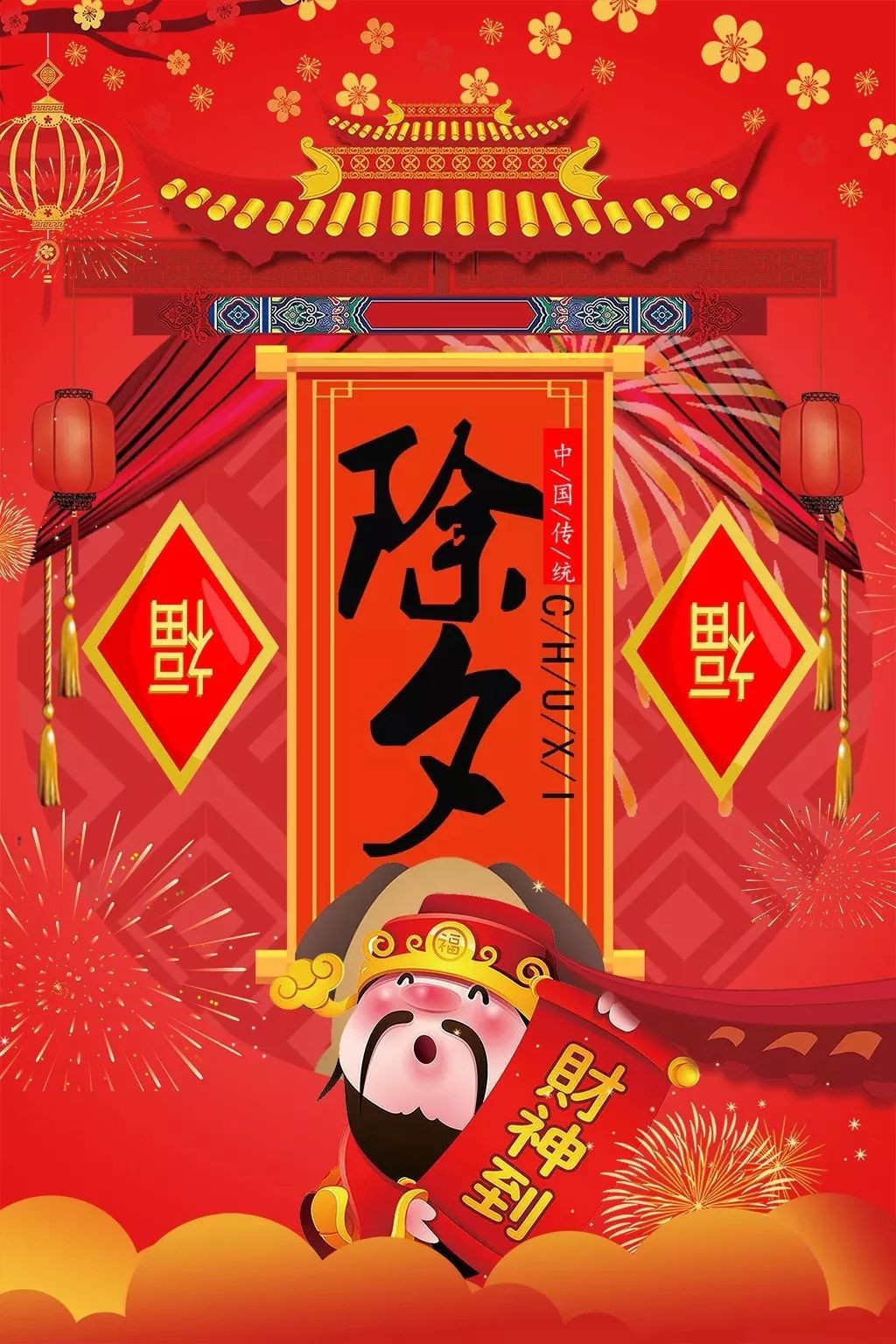 幸福的锣鼓敲开富贵门,快乐的鞭炮引来吉祥路。大红的灯笼照亮光明途,缤纷的烟花献出如意宝。除夕钟声响起时,欢歌笑语声围绕。全家团聚守岁末,美好生活每一天。除夕快乐!