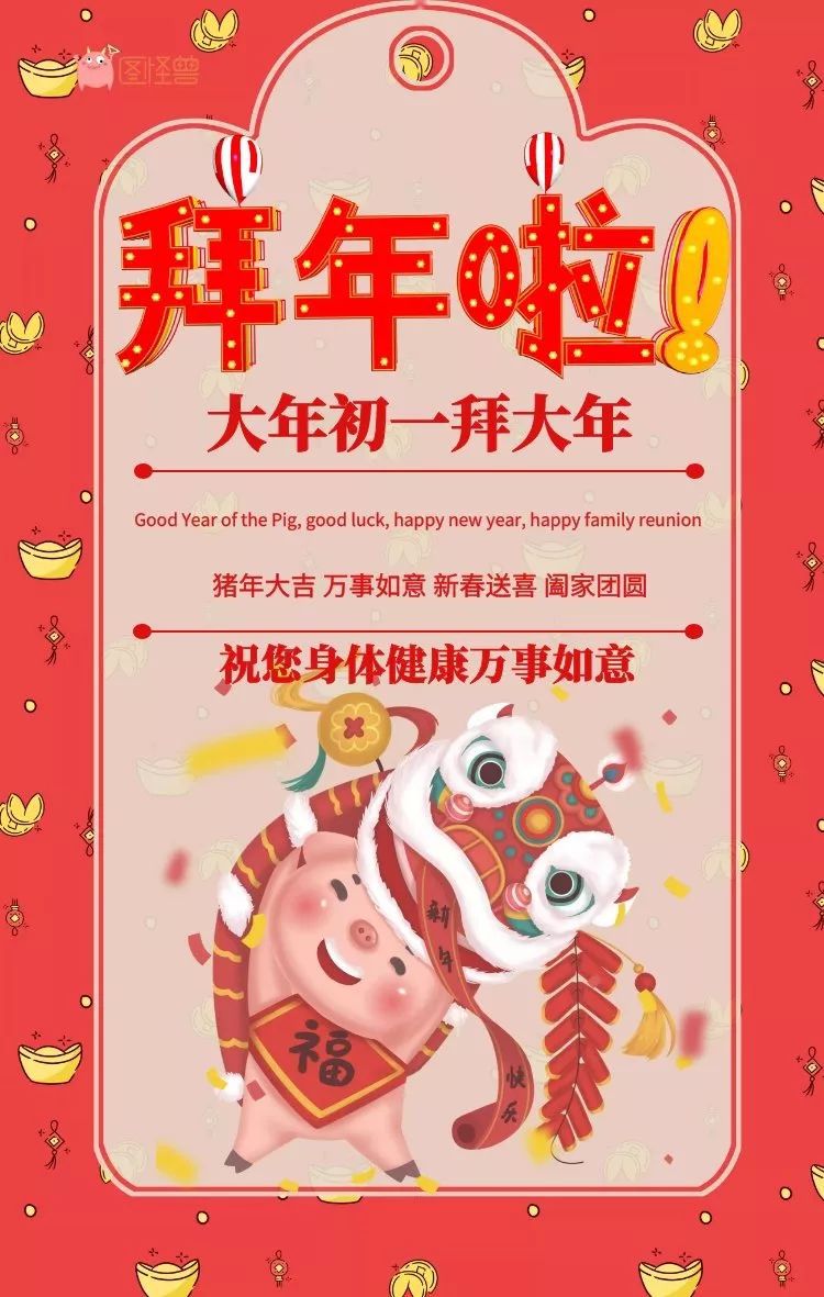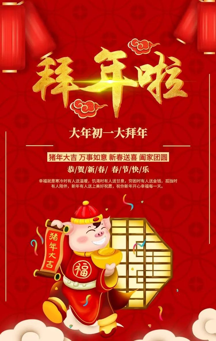 吉祥如意平安年,开心快乐幸福年,喜气冲天幸运年,财源滚滚发财年,万事大吉顺心年,美满团圆喜庆年,愿君猪年事事顺利,美梦成真,岁岁平安,年年如意!