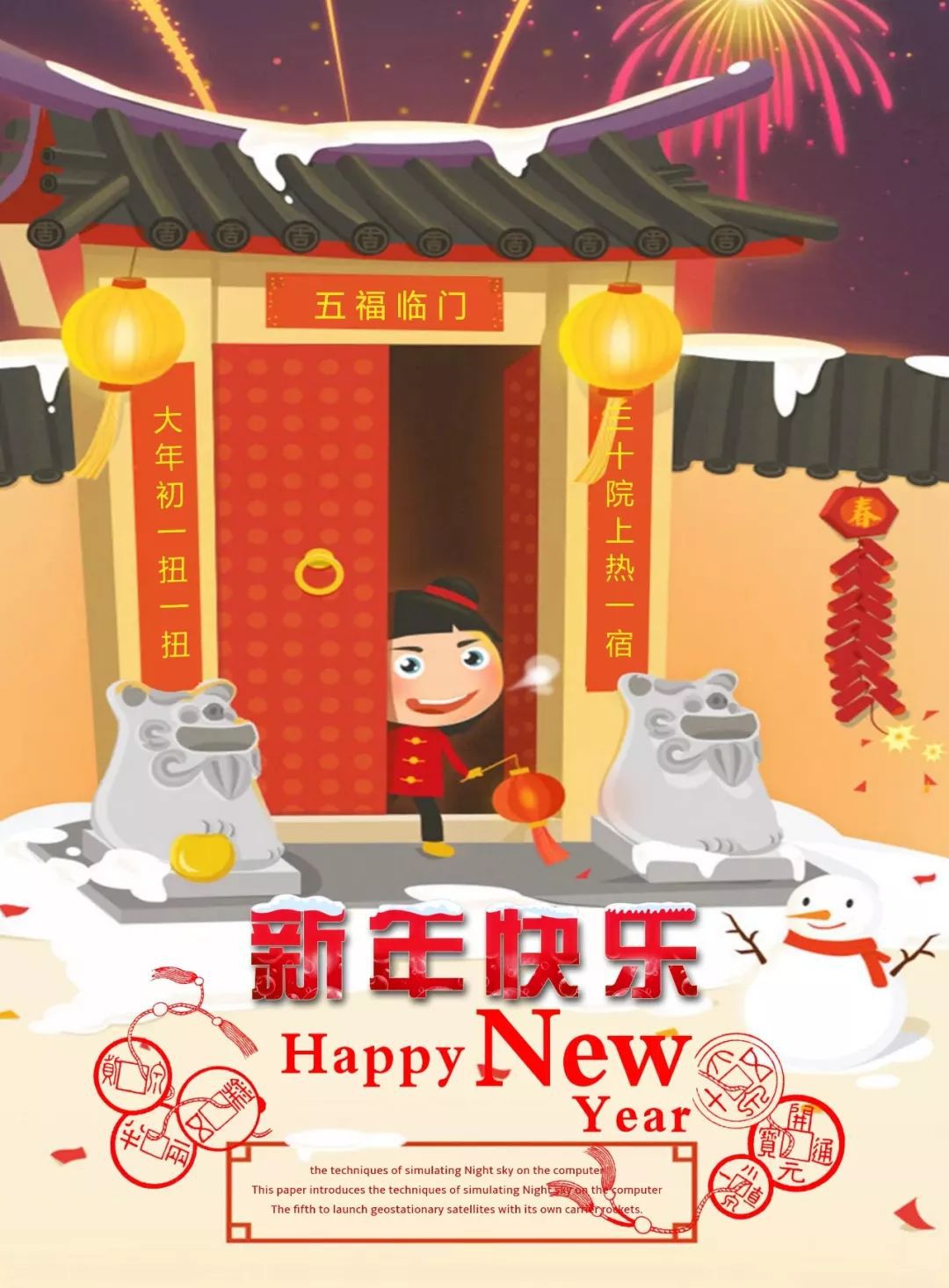辞旧迎新新年到,雪花飘飘山河娇。红梅雪中分外俏,美景引得人自豪。家家户户放鞭炮,小孩高兴满地跑。吉祥如意都送到,声声祝福耳边绕。祝你新年快乐,幸福来到!
